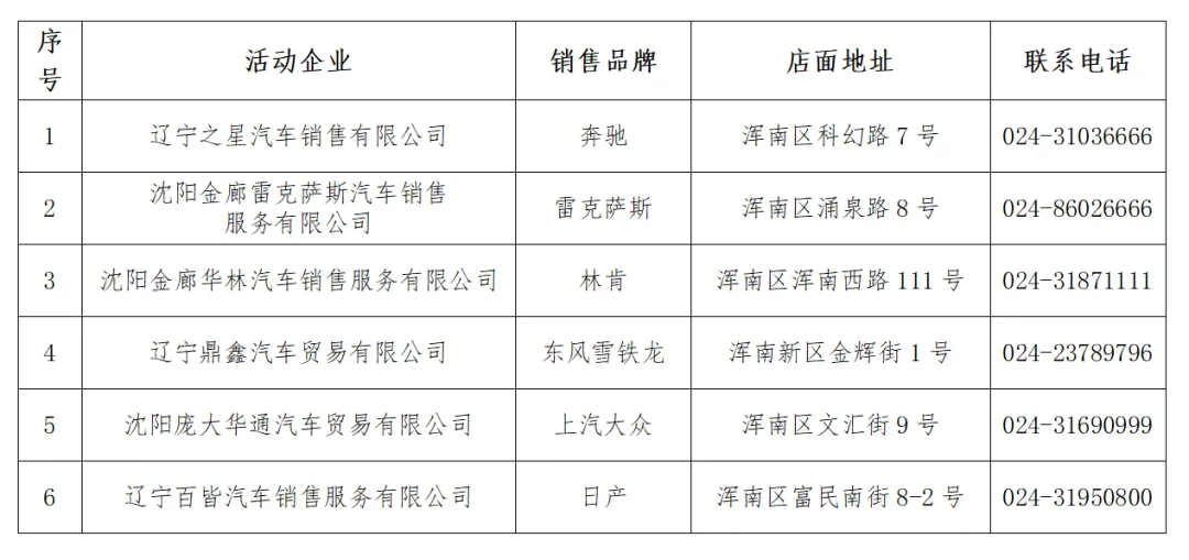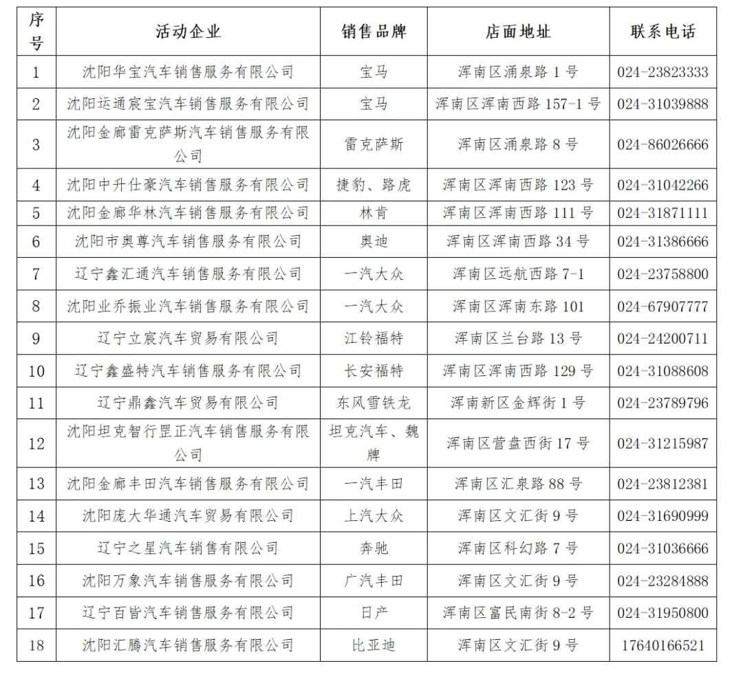 参与沈阳市618汽车促消浑南汽车4S店名单